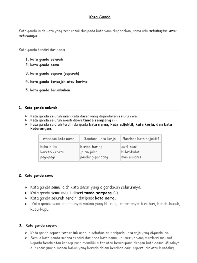 Kata ganda proses yang menggandakan keseluruhan kata dasar samada kata dasar itu mengandungi imbuhan atau 1) penggandaan separa kata tunggal. You can do the exercises online or download the worksheet as pdf. Kuiz latihan kata ganda separa. Kata ganda adalah bentuk kata yang dihasilkan melalui proses mengulangi kata dasar. Sangat mudah dan senang untuk dijawab.
