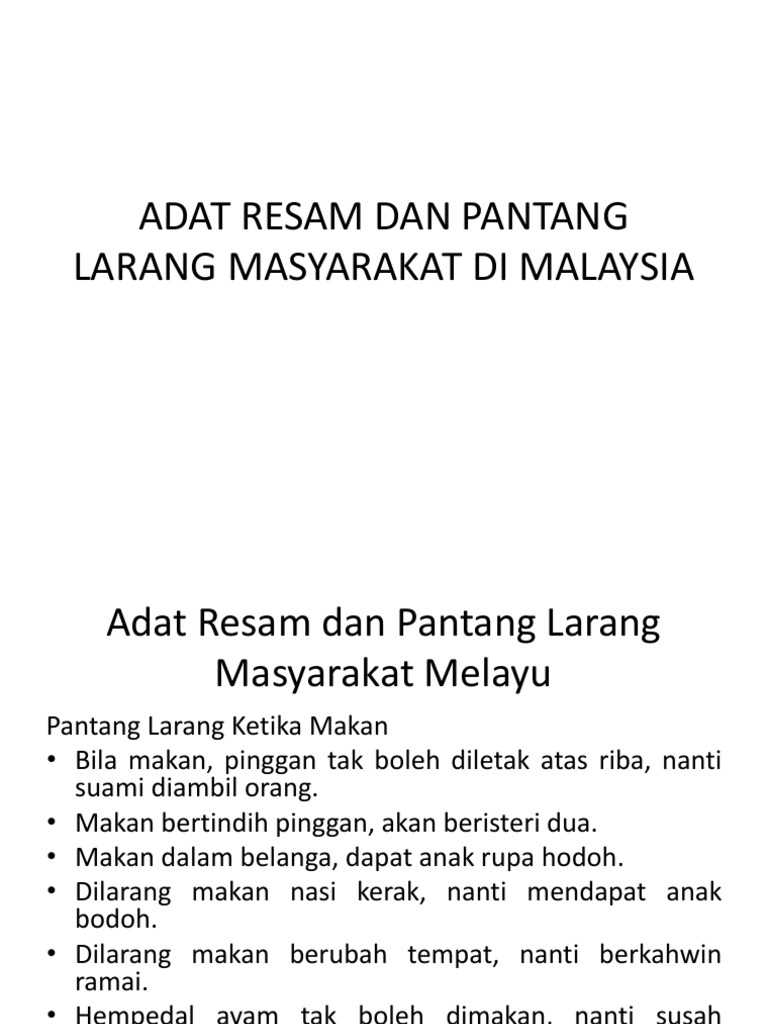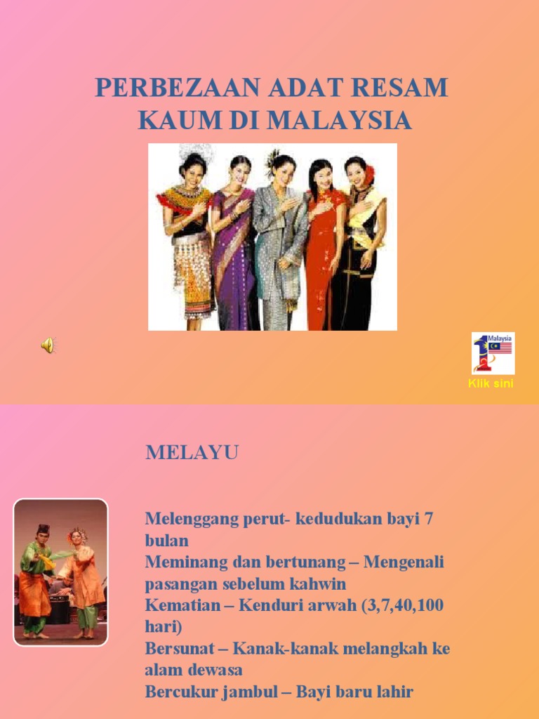 Adat resam merupakan kebiasaan cara hidup yang diamalkan oleh sesuatu masyarakat yang dapat mengambarkan corak budaya masyarakat tersebut. Adat resam kaum di malaysia (sivik tingkatan 3) l2. For more information and source, see on this link : Budaya dan adat resam di malaysia. Adat tersebut bermula dari dalam perut ibu, kelahiran, perkahwinan sehinggalah kematian terdapat di dalam hidup semua masyarakat di malaysia.